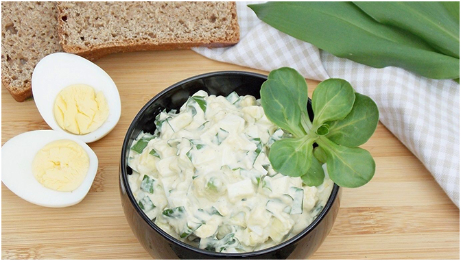 Saure Sahne mit gekochten Eigelben gut verrühren und anschließend Senf und geschnittene Petersilie beimengen. Die gesalzene kalte Zucchinimasse hinzufügen und alles nochmals gut verrühren.