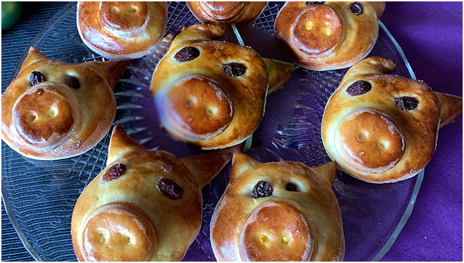 6 Rosinen als Augen, die Öhrchen wie kleine Kipferln formen und alles mit Eidotter gut verkleben.