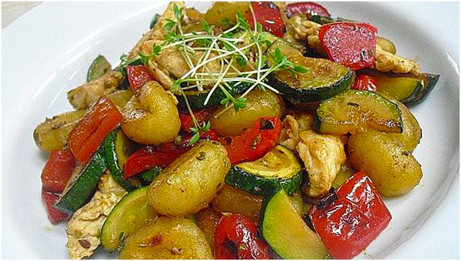 2 EL Öl erhitzen. Das Fleisch darin rundherum ca. 3 Minuten anbraten. Herausnehmen. Die Gnocchi im verbliebenen Bratfett in ca. 3 Minuten hellbraun braten und herausnehmen. 2 EL Öl in der Pfanne erhitzen. Zucchini mit Paprika hineingeben, 6 Minuten anbraten. Knoblauch, Oregano zufügen, kurz anschwitzen. Fleisch und Gnocchi dazugeben, Brühe angießen und aufkochen lassen. Mit Salz und Pfeffer würzen.