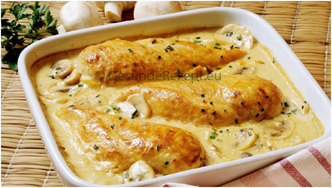 Champignonrahm und Fleisch in eine ofenfeste Form geben, Käse darüberstreuen und im vorgeheizten Backofen (E-Herd: 200 °C/ Umluft: 175 °C/ Gas: Stufe 3) 20–25 Minuten backen.