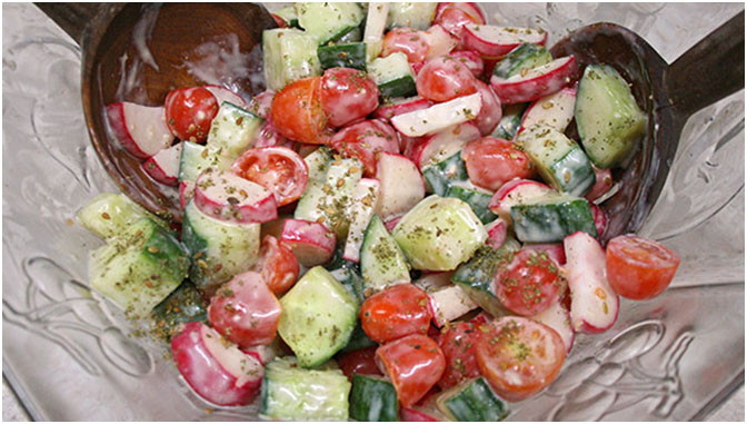 eine große grüne Schlangengurke, oder entsprechend mehr von Landgurken mit bekannter biologischer Herkunft, oder aus dem eigenen Garten waschen, samt der grünen Schale, oder noch besser, zur Hälfte in abwechselnden Streifen geschält, auf der Gemüsereibe zu groben Gurkenraspeln reiben. Salz darüber streuen und unter die Gurken mischen.