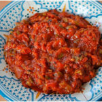 1 – 2 reife Tomaten mit einem Messer über Kreuz leicht an der Haut einritzen, für 30 Sekunden in kochendes Wasser legen, heraus nehmen, mit kaltem Wasser abschrecken und die Tomatenhaut abziehen.