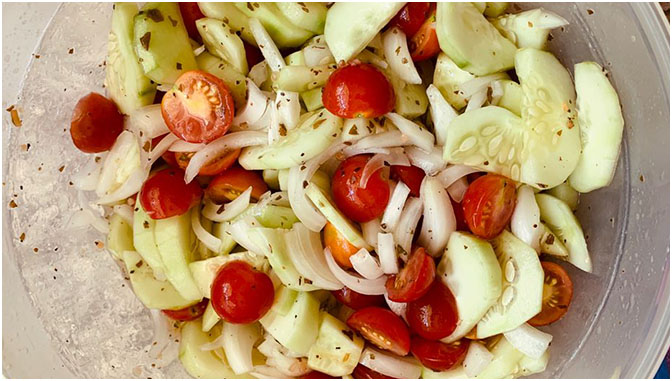 Die Gurke schälen, halbieren und schneiden. Die Tomaten waschen, den Strunk entfernen und die Tomaten vierteln. Alles in eine Schüssel geben, das Salz unterheben und ziehen lassen.
