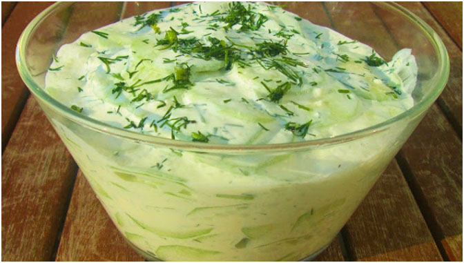 Die Salatgurke schälen und dann auf einer sehr feinen Reibe in Scheiben hobeln. Anschließend mit der sauren Sahne und dem Dill vermengen. Dann kräftig salzen und pfeffern. Alles noch einmal gut durchmischen.