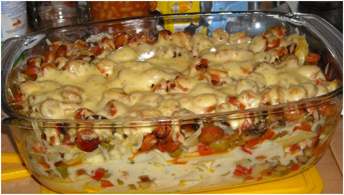 Verlegung2. In einer Auflaufform die Hälfte der Nudeln auf den Boden geben, die Hälfte der Würstchen und die Hälfte der Paprika, Zwiebeln und Champignons. Mit Käse bestreuen und wieder Nudeln, Würstchen, Zwiebeln, Paprika und Champignons und dick mit Käse bestreuen. In den Ofen schieben, bis der Käse schmilzt.