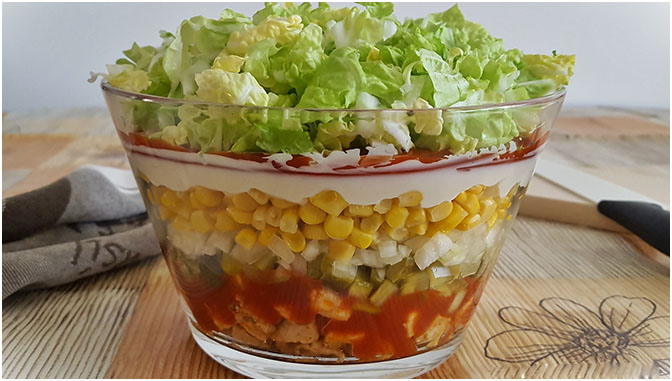 Den Schichtsalat ca. 1-2 Std. kühl stellen und vor dem Servieren miteinander vermischen. Fertig.