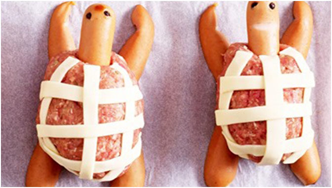 - Aus der Hackmasse 4 ovale Frikadellen formen. Je 4 Wurststücke mit der Schnittfläche nach unten als Beine x-förmig auf ein mit Backpapier ausgelegtes Backblech legen. Frikadellen jeweils als Körper daraufsetzen. Kopfteile aus Wurst in den Frikadellenkörper stecken.