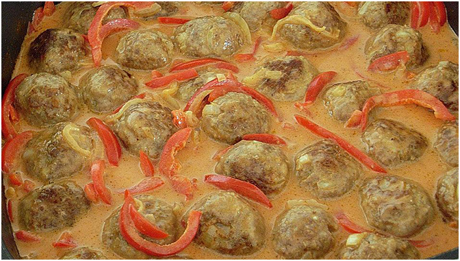 Nun die Zwiebelstreifen in der Pfanne anbraten. Eventuell noch etwas Bratfett hinzugeben. Die Paprikastreifen ebenfalls kurz anschmoren, mit der Brühe ablöschen und alles ca. 3-5 Min. köcheln lassen, nur so lange, dass die Paprikastreifen noch bissfest sind. Ajvar und Sahne hinzugeben und mit Pfeffer und Salz abschmecken. Kartoffelstärke mit Wasser anrühren und die Sauce damit andicken. Zum Schluss die Hackbällchen in der Sauce erwärmen.