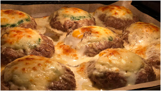 1 große Packung Spinat auftauen. Aus dem Hack Nester herstellen , einen hohen Rand formen . Wenn die Nester fertig sind mit 2 Esslöffeln Spinat füllen, darauf jeweils ein Ei geben , dieses mit Salz und Pfeffer bestreuen und um das Ei geriebenen Mozzarella legen .