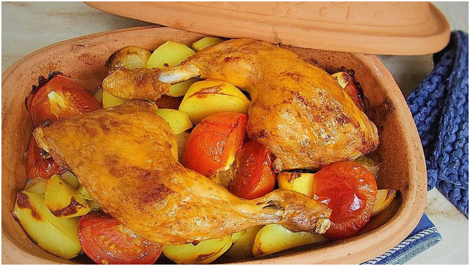 Die Kartoffeln mit Tomaten und Zwiebeln vermischen und schichtweise in den Römertopf legen. Jede Schicht mit Salz und Pfeffer bestreuen. Oben darauf die Hähnchenschenkel legen, mit der flachen Seite nach unten.