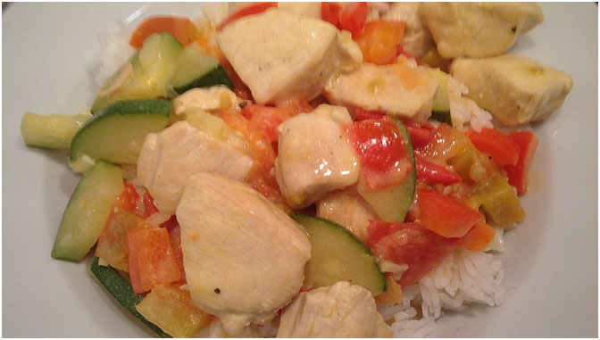 In der Zwischenzeit Zucchini, Gurke und Tomaten klein schneiden. Hähnchen beiseitelegen und warm halten.