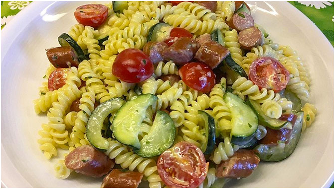 Herzhafter Nudelsalat mit Zucchini, Schinken Pfefferbeißer und Tomaten