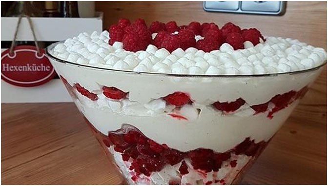 Baiser in kleine Stücke schneiden, Sahne leicht anschlagen. Alles schichtweise in eine Glasschüssel geben, beginnend mit dem Baiser, Himbeeren, Sahne, Baiser, Himbeeren und nochmals Sahne. Anschließend alles 2 Std. in den Kühlschrank stellen.