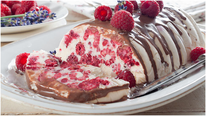 Die Eistorte mit den zurückgelegten Himbeeren garnieren und sofort servieren.