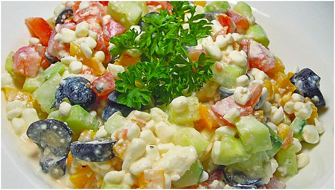 Gemüse klein schneiden und in einer Schüssel mit dem Hüttenkäse und dem Mais gut vermischen, würzen, fertig!