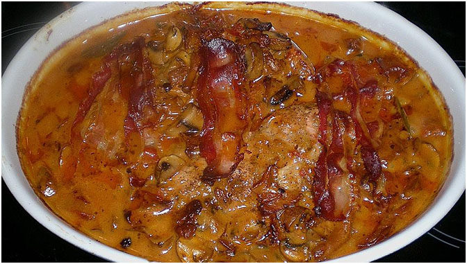 Schnitzel in eine gefettete Auflaufform legen. Die Soße darüber gießen. Speck darauf legen. Im heißen Ofen (E – Herd 200°) 50 – 60 Minuten backen. Nach 25 – 30 Minuten zudecken. Dazu schmecken Salzkartoffeln oder Spätzle.