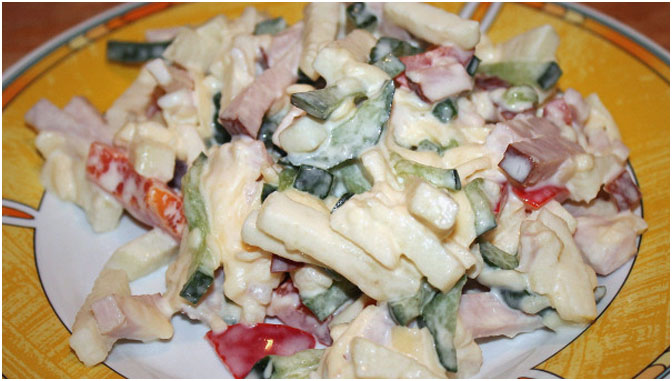Alle Zutaten kleingeschnitten in eine Schüssel geben, vorsichtig mischen. Am besten ein paar Stunden durchziehen lassen.