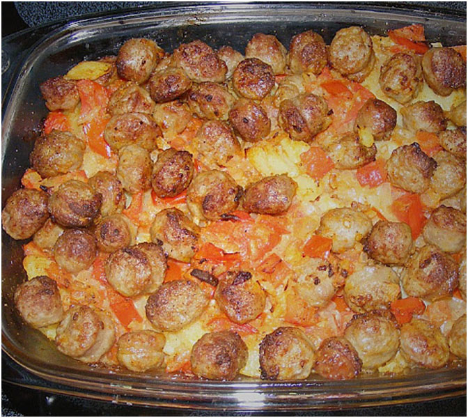 Die leicht abgekühlten, gekochten Kartoffeln in Scheiben schneiden und in eine Auflaufform geben. Die gebratenen Zwiebeln und Paprikawürfeln darüber geben und alles mit der Sahnesoße bedecken. Mit Salz und Pfeffer bestreuen, dann die Würstchenstücke darauf verteilen und alles bei 200 °C für 25 Min backen.