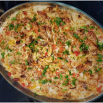 Die leicht abgekühlten, gekochten Kartoffeln in Scheiben schneiden und in eine Auflaufform geben. Die gebratenen Zwiebeln und Paprikawürfeln darüber geben und alles mit der Sahnesoße bedecken. Mit Salz und Pfeffer bestreuen, dann die Würstchenstücke darauf verteilen und alles bei 200 °C für 25 Min backen.