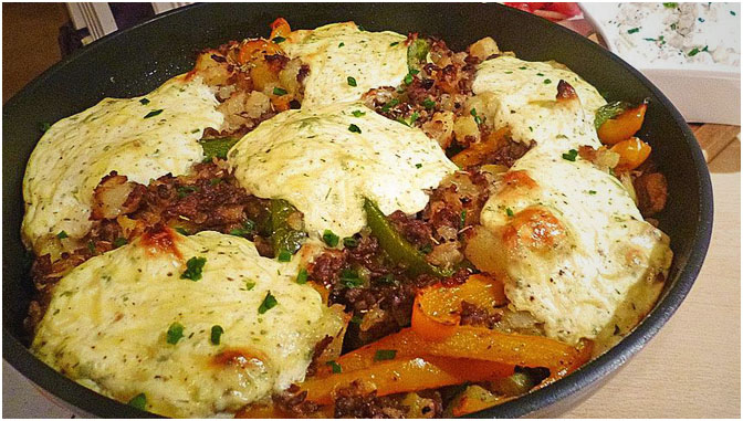 Das Ei mit dem Quark verrühren, abschmecken mit Muskat, Salz und Pfeffer. Eventuell etwas Wasser zugeben. Wenn die Kartoffelscheiben gar sind, die Ei – Quarkmasse darüber verteilen und mit geriebenem Käse bestreuen. Das Ganze noch kurz bei geschlossenem Deckel miteinander verschmelzen lassen.