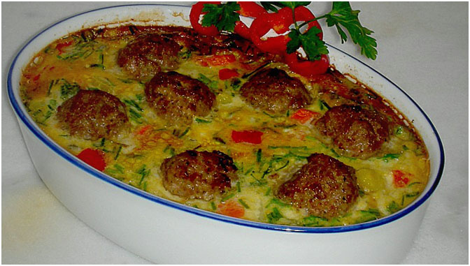 In die mit Butter gefettete Auflaufform eine Lage Kartoffelscheiben schichten. Dann folgt eine Schicht Lauch-Karotten. Nach einer weiteren Lage Kartoffeln wieder Gemüse. Nach jeder einzelnen Schicht mit Käsesauce übergießen. Zum Schluss die Fleischbällchen obendrauf legen und im vorgeheizten Ofen bei 225 °C (Gas Stufe 4) etwa 30 Minuten überbacken.