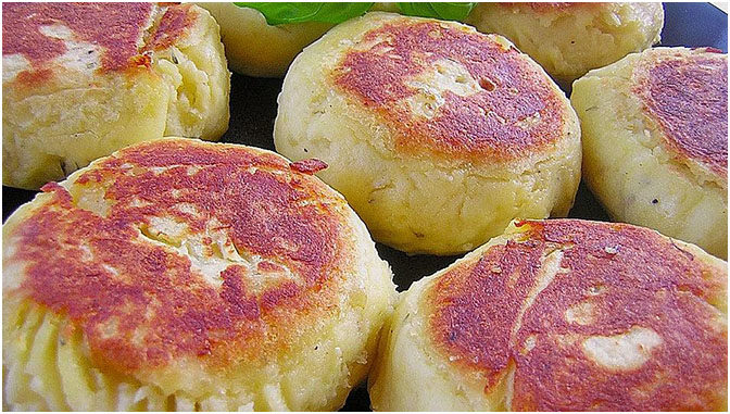 Eier, Kartoffelstärke, Zwiebel- und Knoblauchwürfel zu den Kartoffeln geben, gut verkneten, mit Salz, Pfeffer und Thymian würzen. Aus der Masse acht Frikadellen formen, in die Mitte jeweils ein Stück Schafskäse drücken, mit der Kartoffelmasse gut umhüllen. Öl in einer Pfanne erhitzen, Kartoffelfrikadellen von beiden Seiten goldbraun braten.