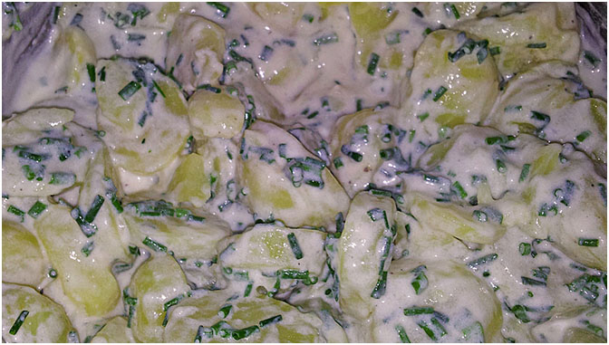 Schmand mit Milch erhitzen, mit Salz, Pfeffer und Muskatnuss würzen. Kartoffeln und Schinken dazugeben und kurz erwärmen. Mit Schnittlauch bestreuen.