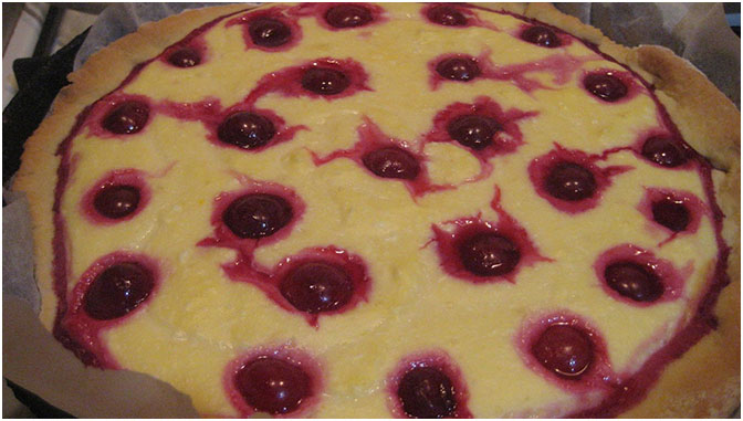 Ofen auf 180 Grad (Umluft 160 Grad) vorheizen. Den Mürbeteig auf einem tiefen, mit Backpapier ausgelegten Blech ausrollen, dabei einen Rand hochziehen. Kirschkompott klecksweise darauf verteilen und die Quarkmasse darüber streichen. Im Ofen 45-50 Min. backen.