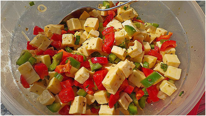 Einfach alle Zutaten miteinander vermischen und den Salat über Nacht oder zumindest einige Stunden durchziehen lassen.