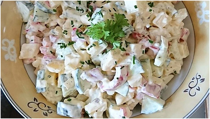 Alle Zutaten kleingeschnitten in eine Schüssel geben, vorsichtig mischen. Am besten ein paar Stunden durchziehen lassen.