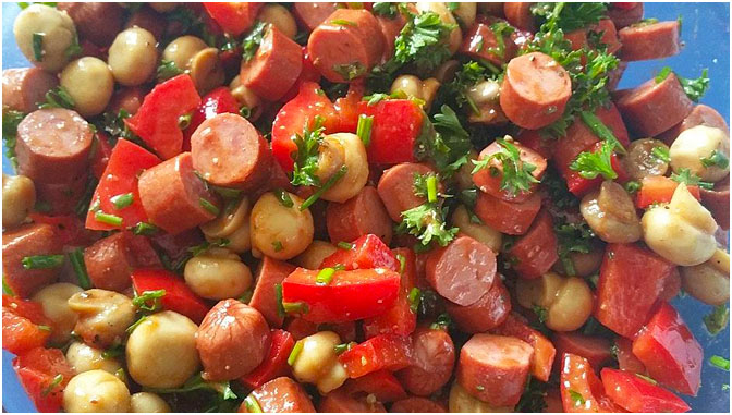Aus Essig, Öl, Senf, Cayennepfeffer und Ketchup ein Dressing herstellen. Die Kräuter hacken und zum Dressing geben. Den Salat mit dem Dressing gut vermischen und einige Stunden an einem kühlen Ort durchziehen lassen.
