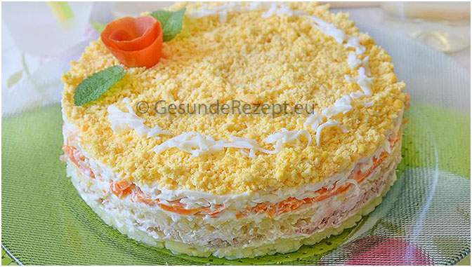4. Entfernen Sie die Schale von den Kartoffeln und reiben Sie eine feine Reibe ein. Legen Sie es auf die Leber und glätten Sie es. Salzen und mit Mayonnaise bestreichen. 5. Ziehen Sie die Rinde von der Möhre ab und hacken Sie sie genauso wie die Kartoffel. Lege es gleichmäßig auf eine Schicht Kartoffeln und tupfe mit Mayonnaise.