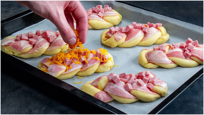 - Die Zöpfe auf ein Backblech geben, mit Schinkenwürfeln und geriebenem Käse bestreuen, und noch 10 Minuten gehen lassen.