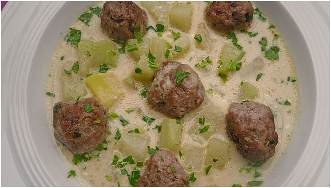 Die Hack-Klößchen wieder dazugeben und im heißen Eintopf ziehen lassen. Nach Belieben zum Servieren auf jeden Teller einen Löffel Crème fraîche oder Schmand geben!