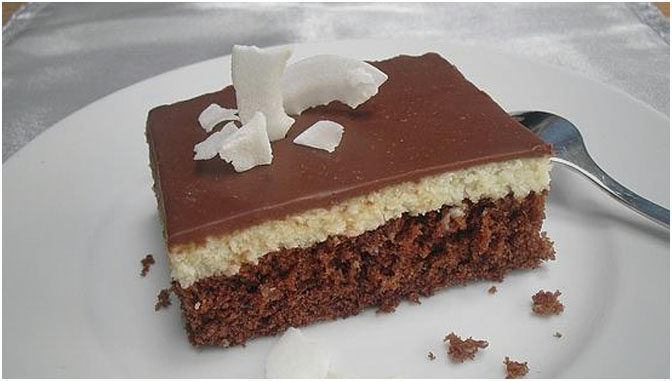 Für den Belag aus der Milch und dem Grieß einen Grießbrei kochen. Von der Herdplatte nehmen und die Butter in kleinen Stücken unterrühren. Dann den Puderzucker einrühren und zum Schluss die Kokosraspel gut einarbeiten. Die Kokosmasse auf den abgekühlten Boden streichen und fest werden lassen.