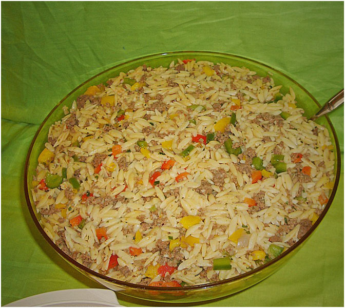 Die Kritharaki (gibt es in jedem gut sortierten Supermarkt dort, wo auch Couscous und Bulgur zu finden sind) in Salzwasser ca. 14 Minuten garen und abgießen. Die Paprikaschoten sehr klein würfeln (Reiskorngröße), die restliche halbe Zwiebel ebenfalls und in drei Beuteln Salatfix „Gartenkräuter“ mit etwas Öl ziehen lassen.