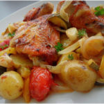 Die Kritharaki (gibt es in jedem gut sortierten Supermarkt dort, wo auch Couscous und Bulgur zu finden sind) in Salzwasser ca. 14 Minuten garen und abgießen. Die Paprikaschoten sehr klein würfeln (Reiskorngröße), die restliche halbe Zwiebel ebenfalls und in drei Beuteln Salatfix „Gartenkräuter“ mit etwas Öl ziehen lassen.