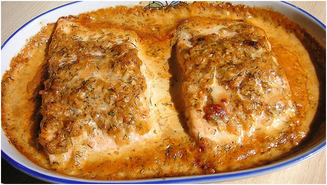 Die Schalotte fein würfeln, kurz in etwas Fett glasig anschwitzen und zur Sahne hinzugeben. Jetzt die Sauce auf den Lachs in der Form verteilen und im auf 180 °C vorgeheizten Backofen bei Umluft ca. 20 – 30 min. backen.