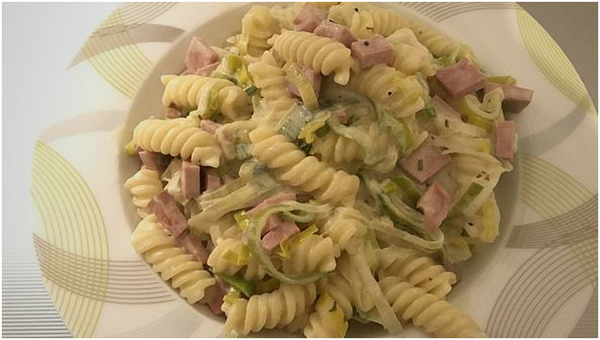 Den Fleischkäse in Würfel schneiden und in einer Pfanne mit wenig Fett anbraten. Lauch in feine Ringe schneiden und zum Fleischkäse geben und kurz mit braten. Mit Brühe ablöschen. Frischkäse, Schmand und Senf einrühren. Die Nudeln dazu geben. Soßenbinder einrühren, bis die Soße die gewünschte Konsistenz erreicht hat. Mit Salz, Pfeffer und Gewürzen nach Geschmack abschmecken. Zum Schluss noch einen Schuss Essig unterrühren, dass alles leicht säuerlich schmeckt.
