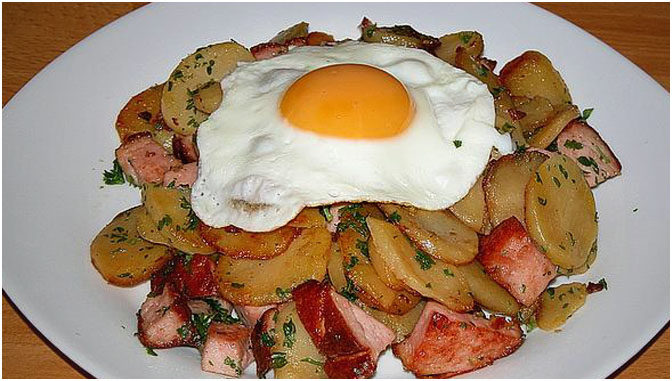 Kartoffeln pellen und in grobe Würfel schneiden. Butterschmalz in einer großen Pfanne erhitzen und die Kartoffeln darin braten. Mit Salz, Pfeffer, Kümmel und Muskat würzen. Den Leberkäse würfeln, zu den Kartoffeln geben und ca. 5 min mitbraten.Die Eier in einer anderen Pfanne in wenig Butter zu Spiegeleiern braten.