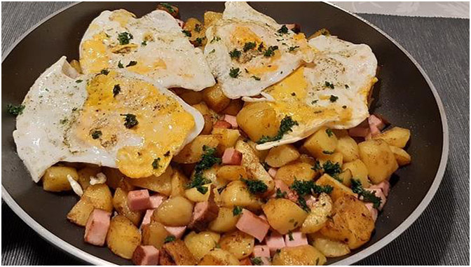 Kartoffeln pellen und in grobe Würfel schneiden. Butterschmalz in einer großen Pfanne erhitzen und die Kartoffeln darin braten. Mit Salz, Pfeffer, Kümmel und Muskat würzen. Den Leberkäse würfeln, zu den Kartoffeln geben und ca. 5 min mitbraten.Die Eier in einer anderen Pfanne in wenig Butter zu Spiegeleiern braten.