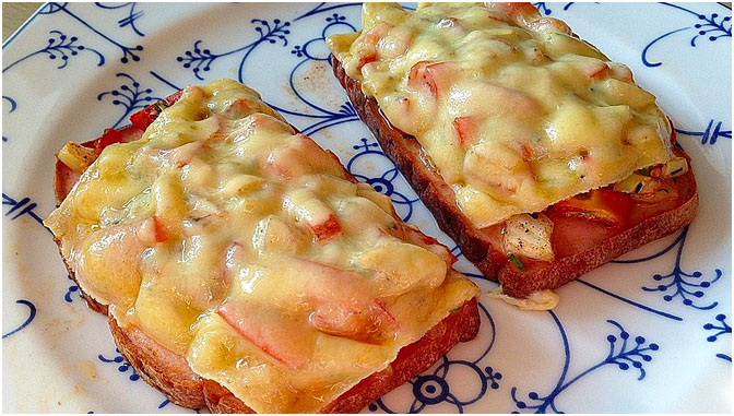 Leberkäse auf ein mit Backpapier ausgelegtes Backblech legen, die Tomatenmischung darauf verteilen und mit jeweils einer halben Scheibe Käse belegen. Im vorgeheizten Backofen bei 150 °C (Umluft oder E-Herd) überbacken, bis der Käse geschmolzen ist (ca. 10 Minuten).