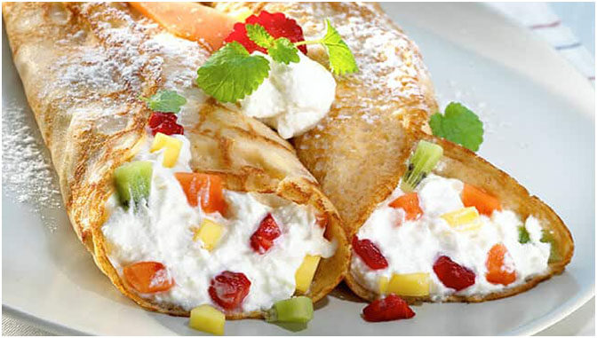 Obst-Ricottacreme auf die Crêpes geben, zusammenrollen und nach Wunsch mit Puderzucker bestäubt servieren und mit Minze garnieren.