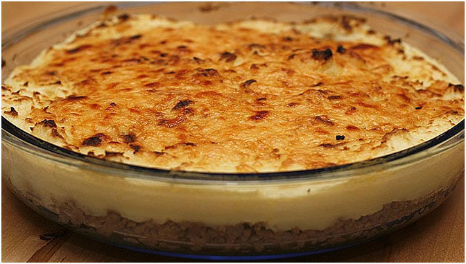 Anschließend das Hackfleisch und darauf den Kartoffelbrei in eine Auflaufform geben. Mit dem Käse bedecken.
