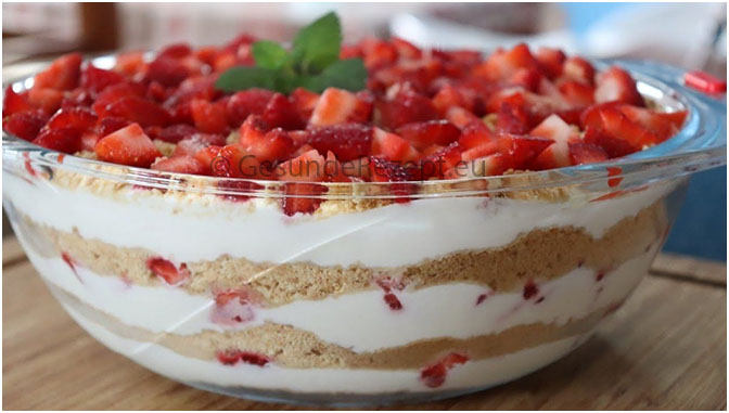 Den Joghurt auf die Mandelbrösel geben und zum Schluss die pürierten Erdbeeren darüber geben. Wer mag, kann das Dessert noch mit ein paar frischen Erdbeeren toppen.