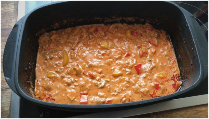 Die Zwiebeln zerkleinern, mit dem Gehackten in Öl anbraten und mit Salz, Pfeffer und Paprikapulver würzen. Dann in den Ultra 5,0 l umfüllen. Paprikaschoten, Gurke, Tomaten und evtl. Champignons klein schneiden und auf das Gehackte geben. Anschließend die Crème fraîche mit der Texicana Salsa mischen und über alles gießen.