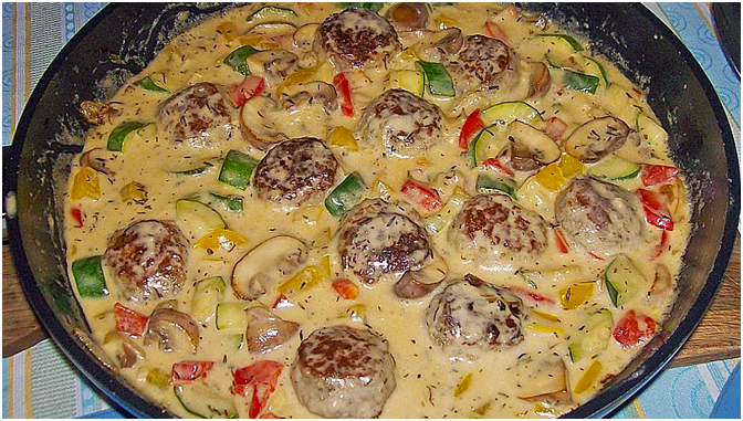 Fett erhitzen und die Hackklöße darin goldbraun braten. Herausnehmen. Zwiebeln im Bratfett glasig dünsten. Champignons und Zucchini zugeben und 5 Minuten mitdünsten.