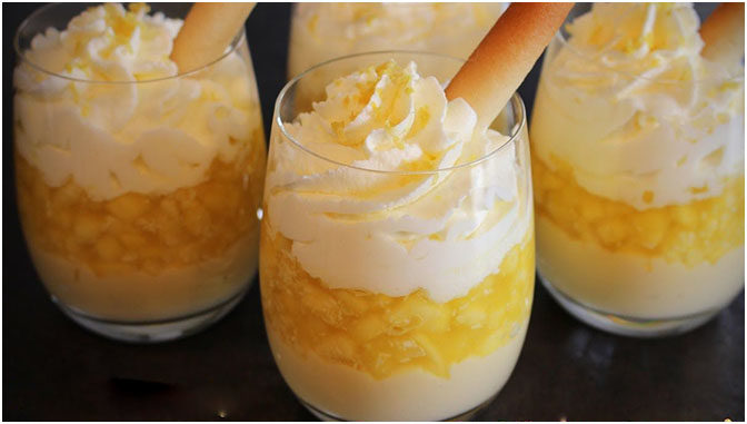 - Ein Drittel der Creme auf vier Dessertschalen oder Gläser verteilen. Die Mangos und danach die Hälfte der restlichen Creme daraufgeben.