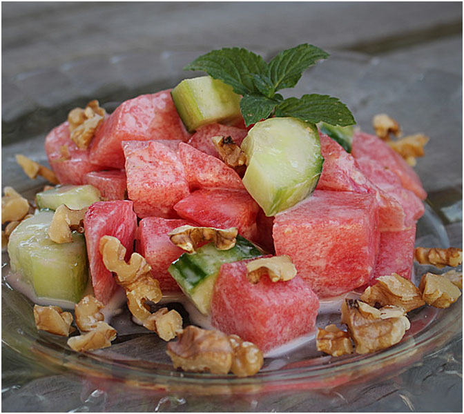 Gurken schälen, halbieren, entkernen und in Stücke schneiden. Schale und Kerne der Melone entfernen und in Stücke schneiden. Minze waschen und kleinhacken, dann zu Melone und Gurken geben.