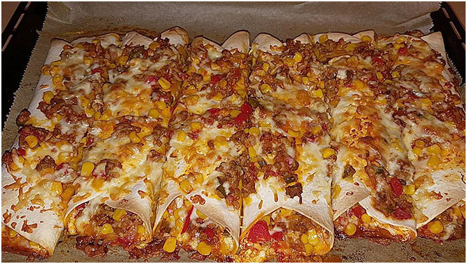 Mit den Gewürzen und etwas Zucker abschmecken. Die Tortillas mit der Crème fraîche bestreichen und die Hackfleischmasse gleichmäßig darauf verteilen. Mit etwas geriebenem Käse bestreuen. Die Tortillas zu Burritos aufrollen und in eine Auflaufform legen.
